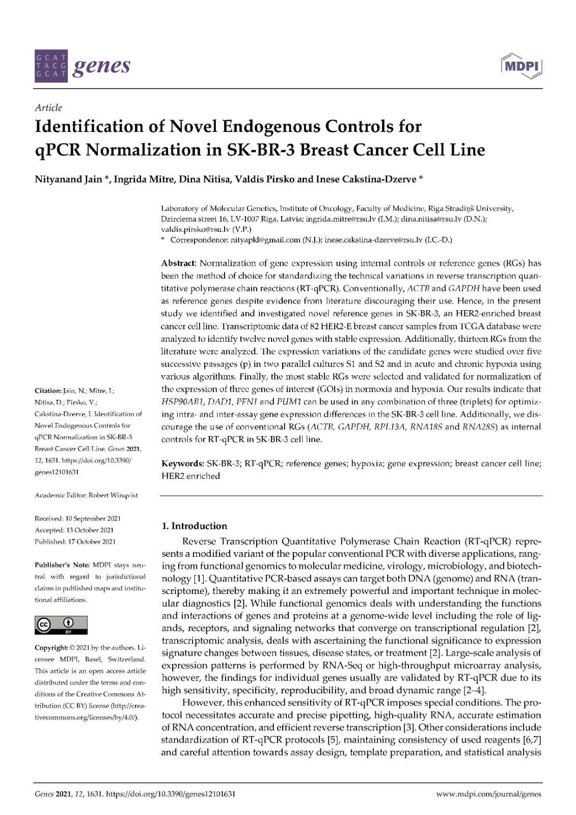 Identification of Novel Endogenous Controls for qPCR Normalization in SK-BR-3 Breast Cancer Cell Line