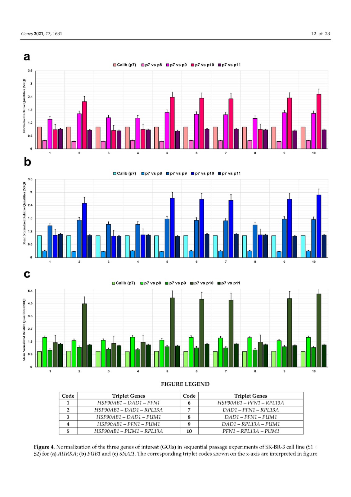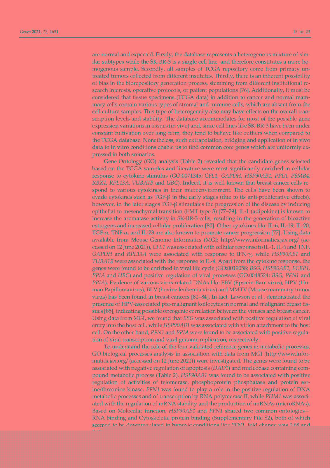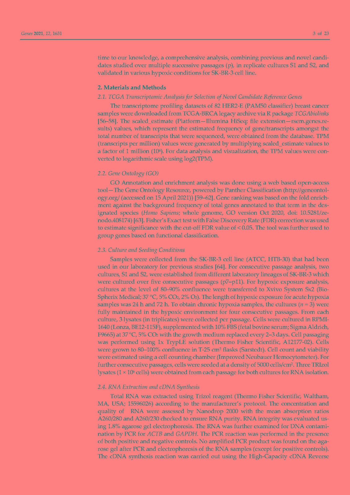 使用内部对照或参考基因 (RG) 对基因表达进行标准化已成为标准化逆转录定量聚合酶链反应 (RT-qPCR) 技术变化的首选方法。传统上,ACTB和GAPDH尽管文献中的证据不鼓励使用它们,但已被用作参考基因。因此,在本研究中,我们在富含 HER2 的乳腺癌细胞系 SK-BR-3 中鉴定并研究了新的参考基因。对来自 TCGA 数据库的 82 个 HER2-E 乳腺癌样本的转录组数据进行了分析,以确定十二个具有稳定表达的新基因。此外,还分析了文献中的 13 个 RG。在两个平行培养物 S1 和 S2 中以及在急性和慢性缺氧条件下,使用各种算法研究了候选基因的表达变化超过 5 次连续传代 (p)。最后,选择最稳定的 RGs 并验证其在常氧和缺氧条件下三个感兴趣基因 (GOI) 的表达正?;?。我们的结果表明HSP90AB1、DAD1、PFN1和PUM1可用于三个(三联体)的任意组合,以优化 SK-BR-3 细胞系中检测内和检测间的基因表达差异。此外,我们不鼓励使用传统的 RG(ACTB、GAPDH、RPL13A、RNA18S和RNA28S)作为 SK-BR-3 细胞系中 RT-qPCR 的内部对照。