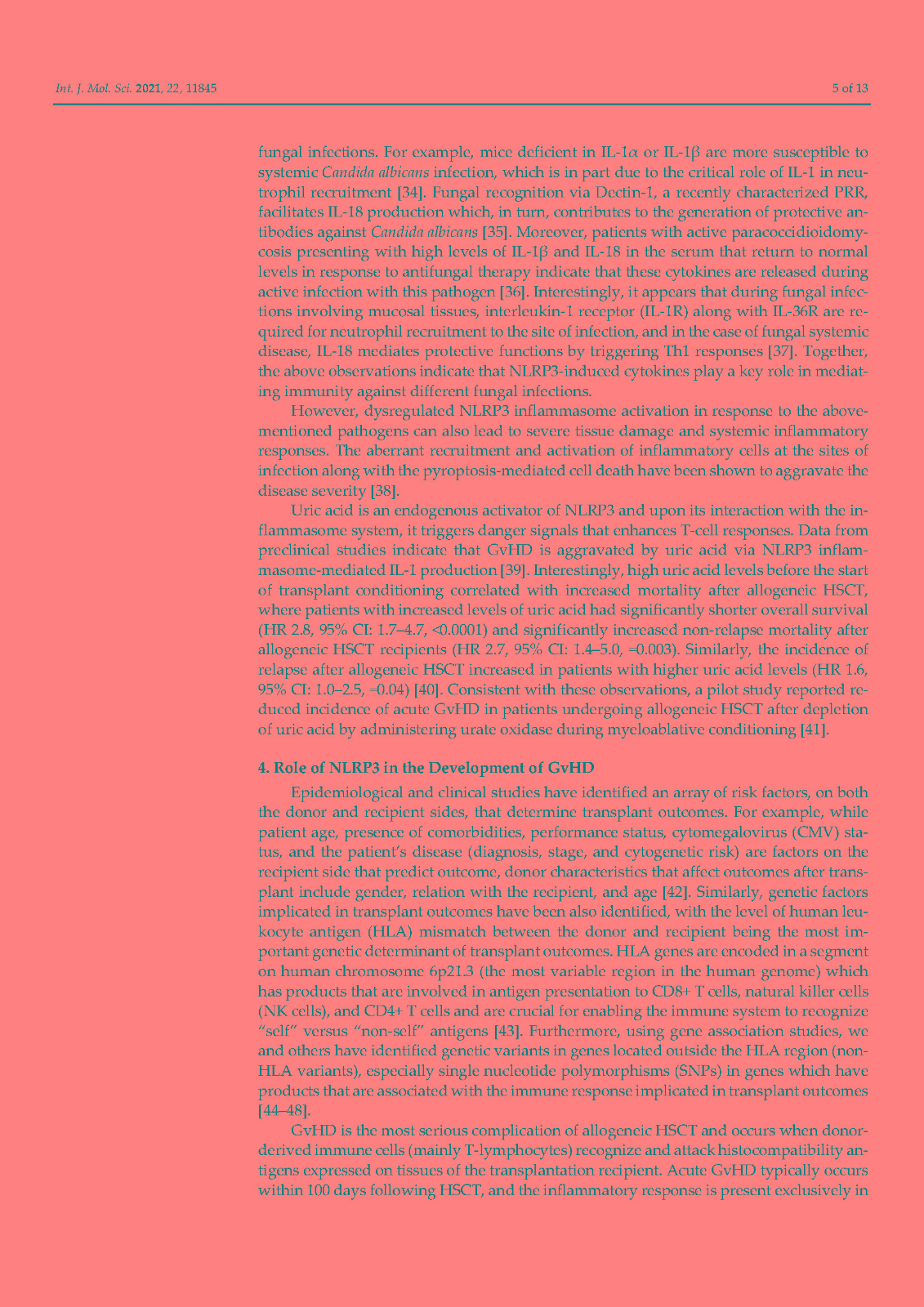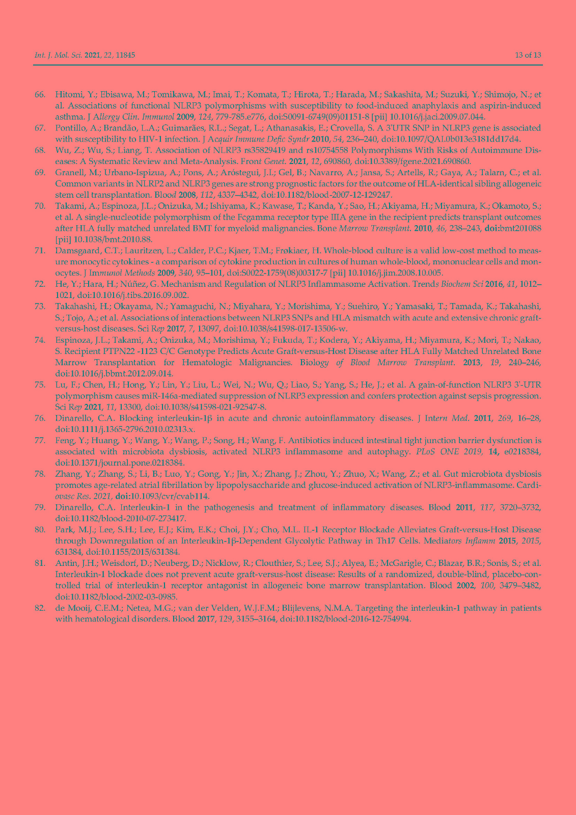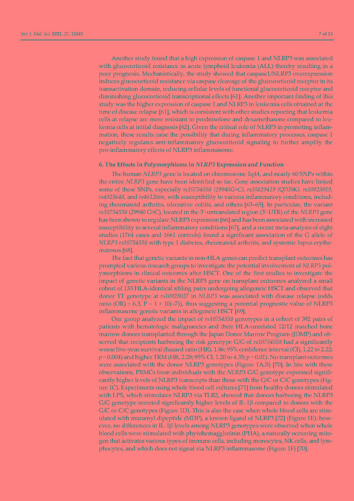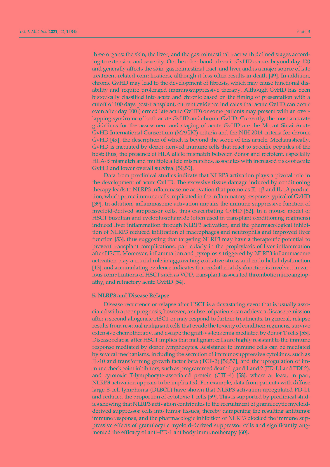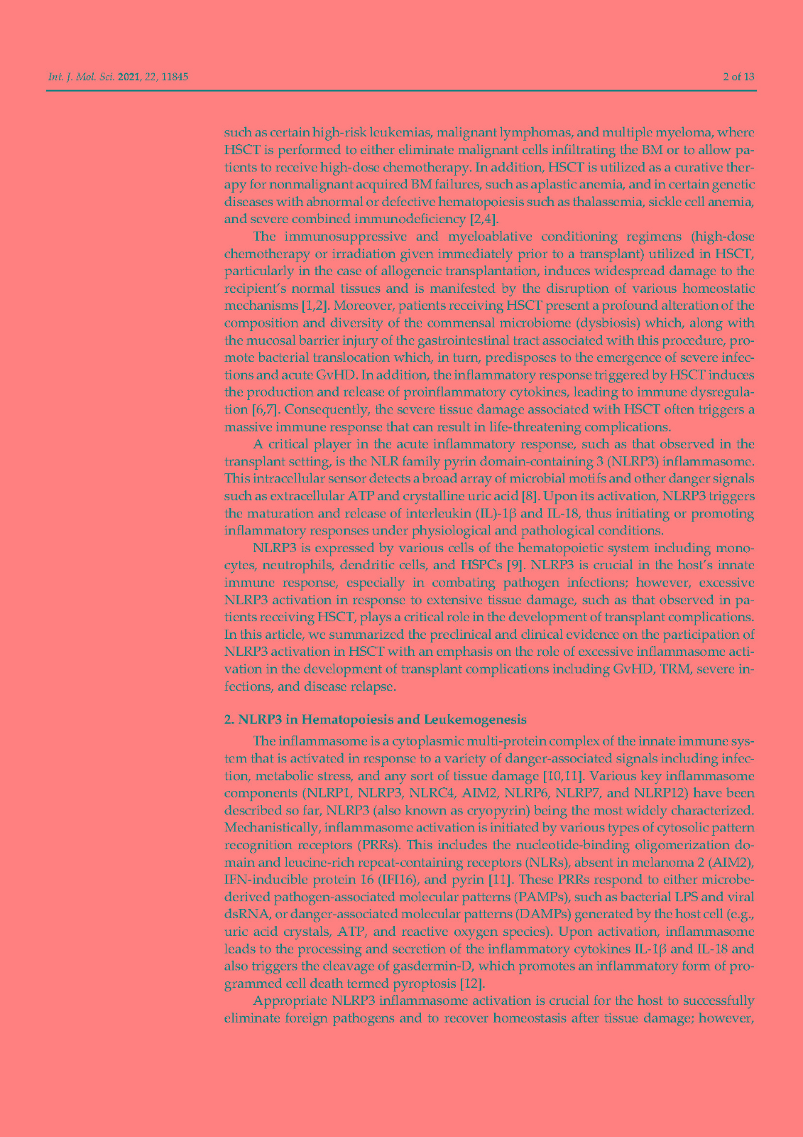 In addition, accumulating evidence indicates that activation of NLRP3 plays a pivotal role in the development of transplant complications in patients receiving hematopoietic stem cell transplantation (HSCT) including graft versus host disease, severe infections, and transplant-related mortality. The majority of these complications are triggered by the severe tissue damage derived from the conditioning regimens utilized in HSCT which, in turn, activates NLRP3 and, ultimately, promotes the release of proinflammatory cytokines such as IL-1β and IL-18. Here, we summarize the implications of NLRP3 in HSCT with an emphasis on the involvement of this inflammasome component in transplant complications.