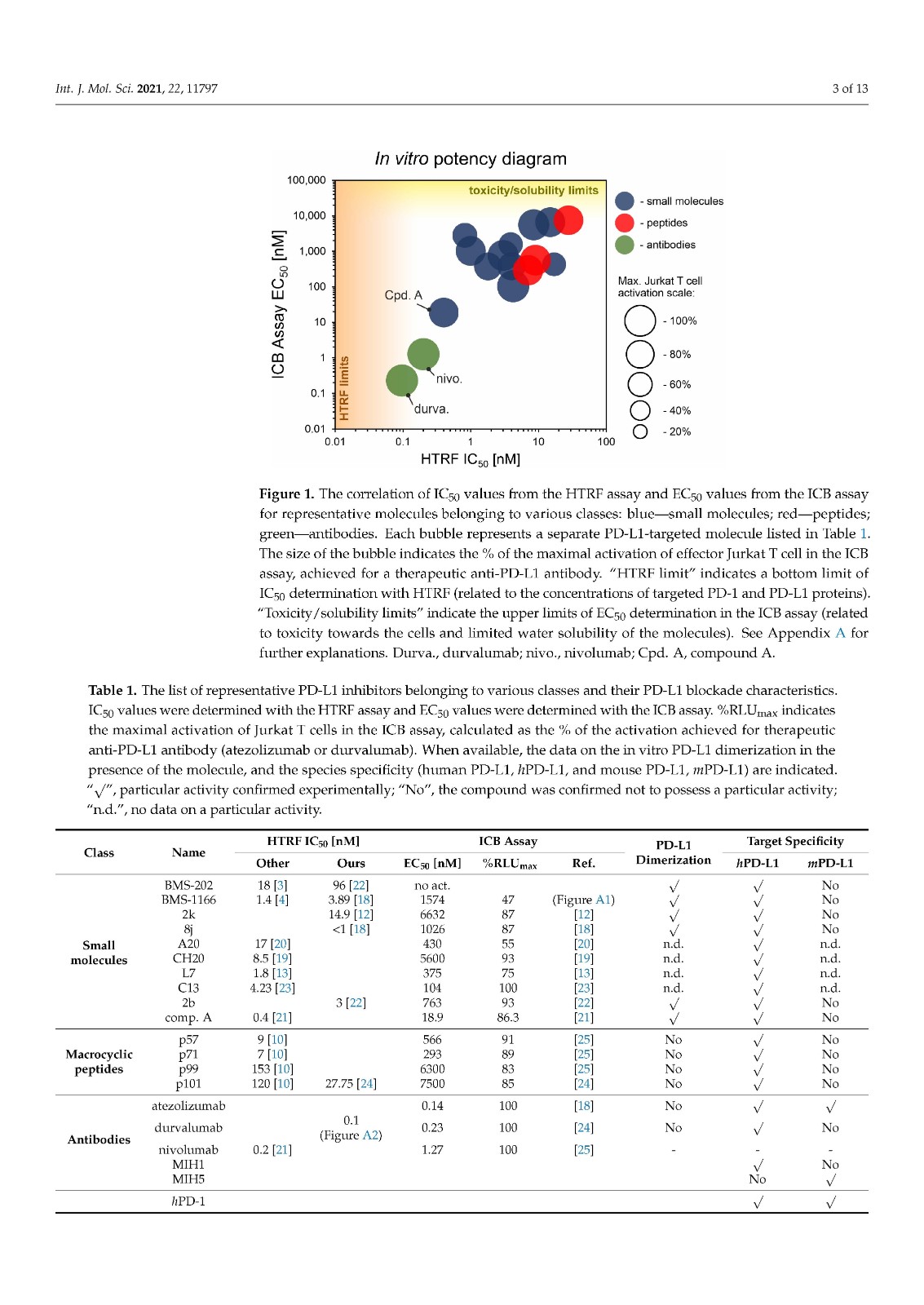 We performed a comparison of the in vitro targeting of the PD-1/PD-L1 immune checkpoint with molecules selected from various classes, including small molecules, macrocyclic peptides, and monoclonal antibodies. For this, two standardized and popular techniques used in the available literature were applied: the protein-based Homogeneous Time-Resolved Fluorescence (HTRF) method and the cell-based Immune Checkpoint Blockade (ICB) assay. Using these methods, three parameters describing the in vitro potency of the tested compounds were determined: (i) IC50 values of the blockade of PD-1/PD-L1 complex formation (from HTRF); (ii) EC50 values of the reactivation of the effector T cells blocked with PD-L1 (from ICB); and (iii) maximal activation levels of the effector T cells, calculated as the % of the activation in the presence of therapeutic anti-PD-L1 antibody atezolizumab or durvalumab. Based on these parameters, a bubble plot was prepared to visualize the differences between groups of molecules (Figure 1). The numeric data are also presented in Table 1.