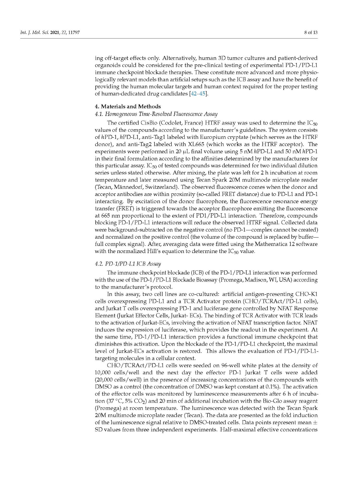我们对 PD-1/PD-L1 免疫检查点的体外靶向与选自各种类别的分子进行了比较,包括小分子、大环肽和单克隆抗体。为此,应用了现有文献中使用的两种标准化和流行技术:基于蛋白质的均相时间分辨荧光 (HTRF) 方法和基于细胞的免疫检查点阻断 (ICB) 检测。使用这些方法,确定了描述受试化合物体外效力的三个参数:(i) PD-1/PD-L1 复合物形成阻断的IC 50值(来自 HTRF);(ii) 欧共体50被PD-L1(来自ICB)阻断的效应T细胞的再激活值;(iii) 效应 T 细胞的最大活化水平,计算为在治疗性抗 PD-L1 抗体 atezolizumab 或 durvalumab 存在下的活化百分比。