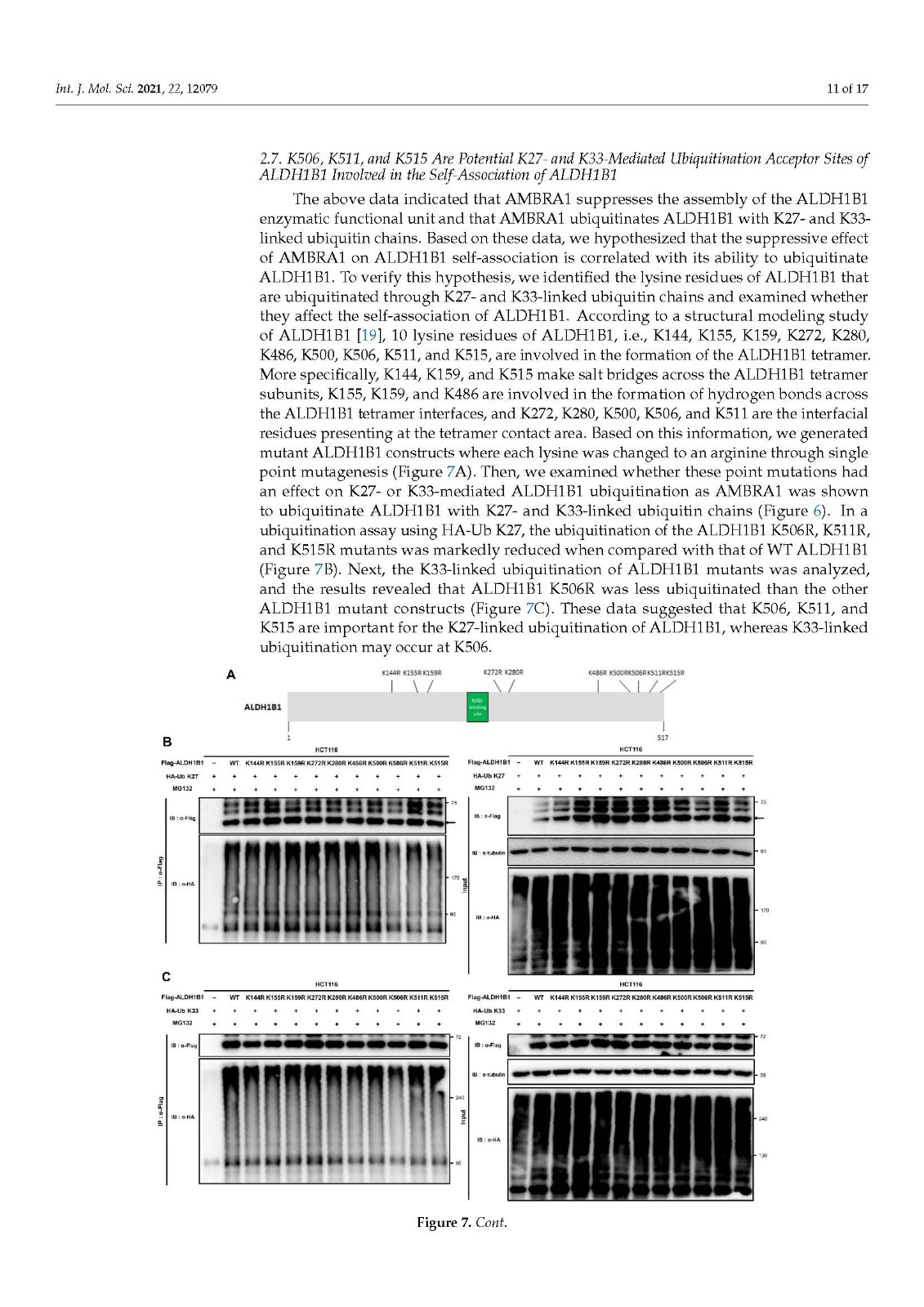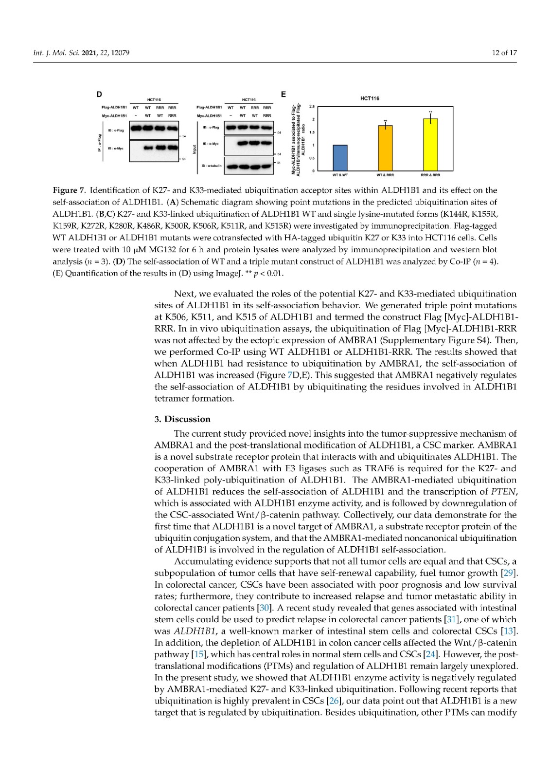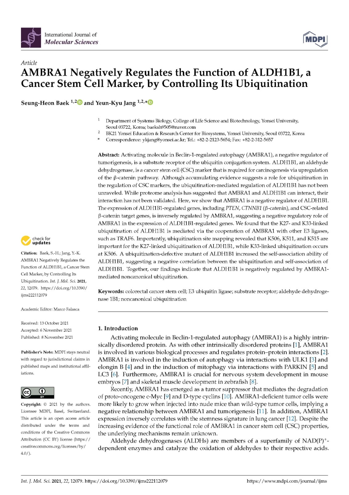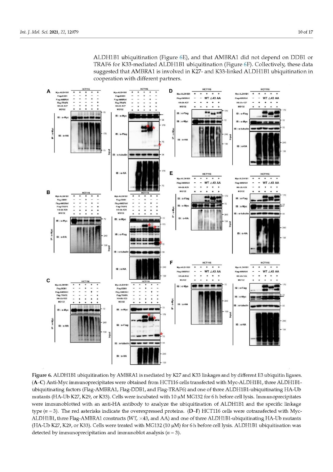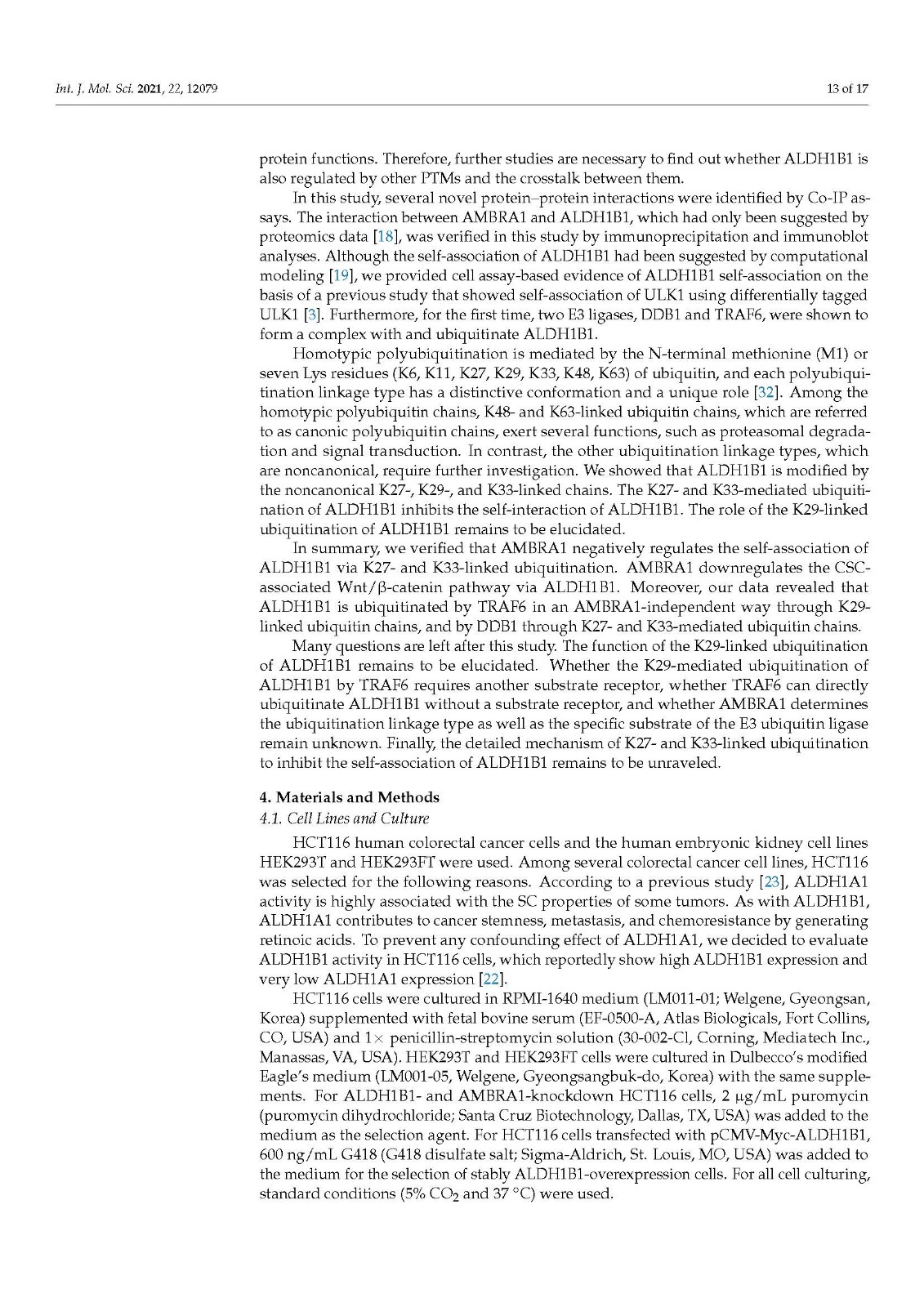 According to the Biological General Repository for Interaction Datasets (thebiogrid.org, Accessed 15 December 2020), ALDH1B1 has been identified as one of the AMBRA1-interacting proteins via affinity purification-mass spectrometry analysis of Flag-AMBRA1-transfected HEK293T human embryonic kidney cells [18]. However, the biological significance of the interaction between AMBRA1 and ALDH1B1 is not yet understood. Here, for the first time, we show that AMBRA1 downregulates the self-association and enzyme activity of ALDH1B1, and subsequently regulates CSC-associated Wnt/β-catenin signaling in an ALDH1B1-dependent manner. Mechanistically, AMBRA1 controls ALDH1B1 function via the ubiquitination of ALDH1B1 with K27- and K33-linked ubiquitin chains. Further, we found that TRAF6 and DDB1, an adaptor protein of the CRL4 complex, are able to ubiquitinate ALDH1B1 in an AMBRA1-independent fashion.
