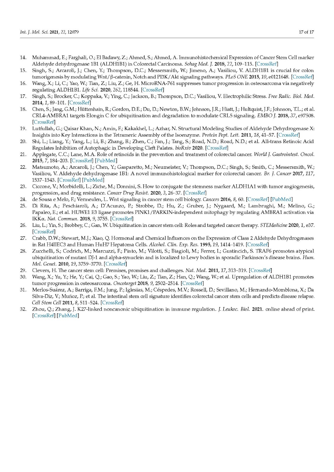 醛脱氢酶 (ALDH) 是 NAD(P) +依赖性酶超家族的成员,可催化醛氧化为其各自的酸。据报道,ALDH1B1 是 ALDH 同工酶之一,在正常人结肠的 SC 区室中严格表达,在人结肠腺癌中高度表达 [ 13 ]。在一项临床研究 [ 14 ] 中,ALDH1B1 的上调与高级别结直肠癌和淋巴结转移的存在相关,这意味着 ALDH1B1 在致癌作用中的潜在作用。结肠癌细胞中 ALDH1B1 的缺失导致 Wnt/β-catenin、Notch 和 PI3K/Akt 通路相关基因(如CTNNB1、Akt和缺口 1 [ 15 ]。骨肉瘤细胞中微小RNA-761对ALDH1B1的负调节通过调节TGF-β信号传导和细胞粘附来抑制肿瘤细胞增殖[ 16 ]。尽管有几条证据表明通过泛素化修饰和调节 CSC 标志物的重要性 [ 17 ],但很少有研究调查调节 ALDH1B1 的调节剂。