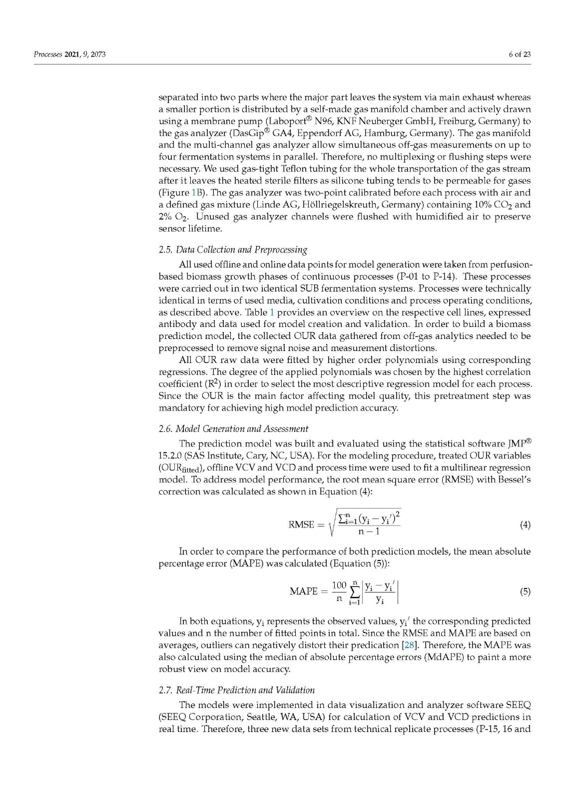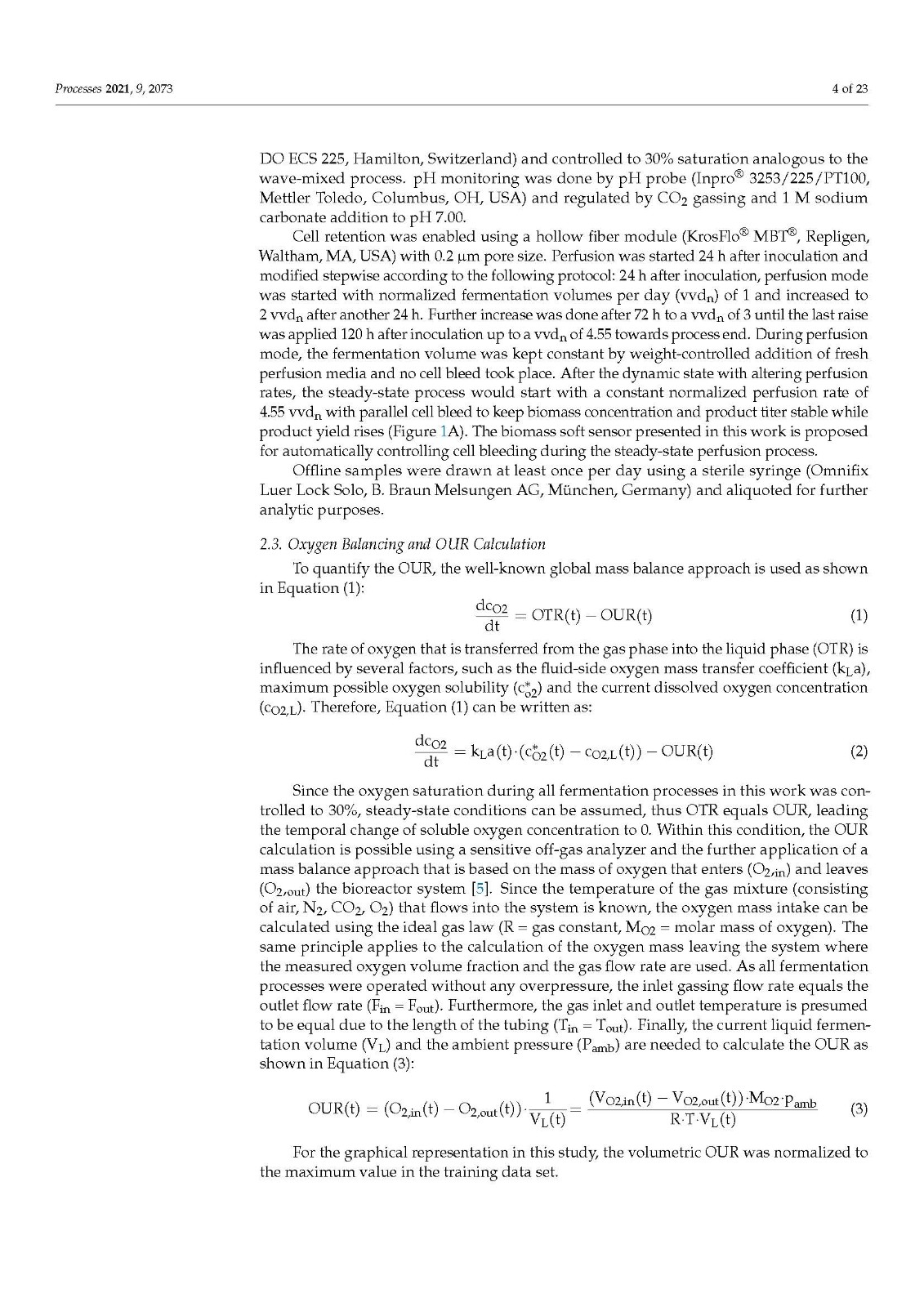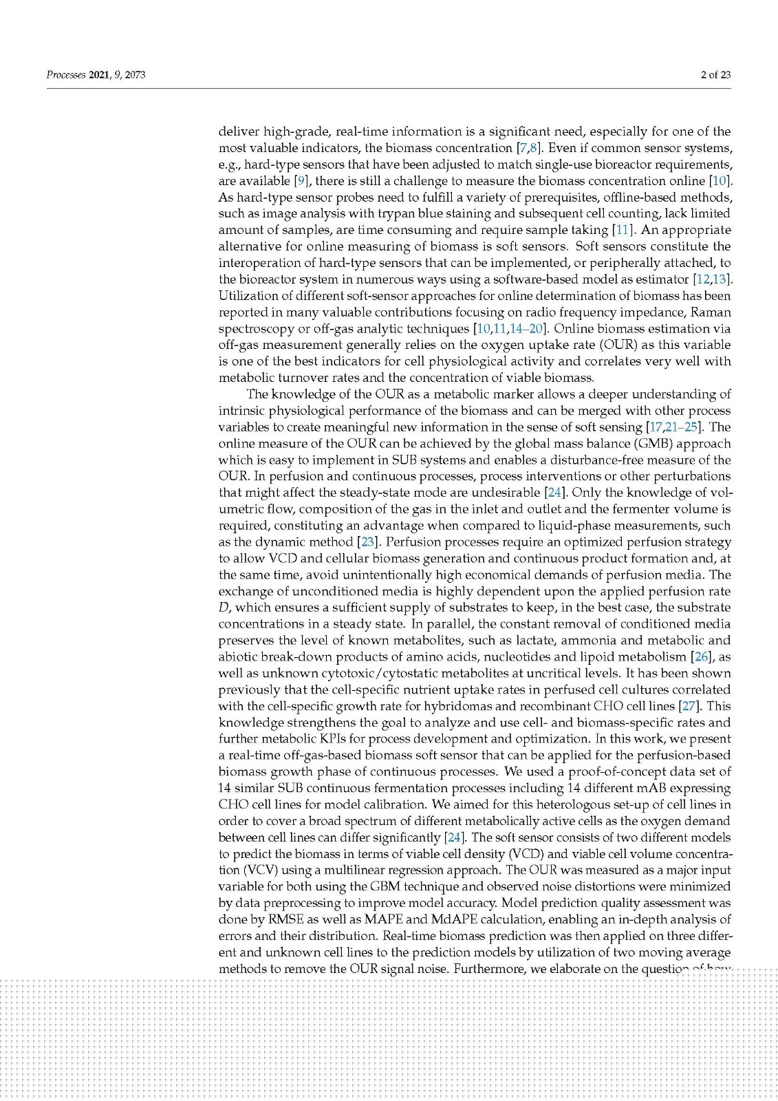 Our data also demonstrated that higher model accuracy was established when VCV instead of VCD was used as biomass depiction. This strengthens our strong belief in a paradigm change regarding biomass description in modern bioprocesses. VCD should no longer be the leading, or the only, measurement looked at when it comes to biomass determination. The cell size or volume, its distribution over time and, of course, the VCV should be used by default to accurately describe the biomass and all derived metabolic variables, such as mAB, lactate production rate, or glucose/oxygen consumption rates. Conclusions, based only on cell density measurements, can lead to wrong assumptions, calculations or other unforeseen misinterpretations, generating a fragmented picture of the biomass [38,40]. As modern bioprocesses can be highly complex and dynamic, the biomass and cellular metabolism analysis should be as comprehensive as possible to generate a comparable and reproducible data basis. Furthermore, the utilization of an off-gas-based soft sensor is easy to implement in SUB systems as well as in common stainless steel plants. For this purpose, the installation of any hard-type probes inside the bioreactor is not necessary and does not increase handling or decrease safety and therefore prevents possible contamination risks. The fundamental correlation of biomass growth and increasing oxygen demand can be used, optimized and extended to generate profound real-time knowledge on diverse bioprocess variables such as the shown biomass and metabolic nutrient rate soft sensor. Moreover, off-gas analysis can be used to determine the true bioreactor pH without any sampling or as non-invasive method for online pCO2 monitoring, which underlines the flexibility and outstanding character of having an off-gas analyzer implemented and running.