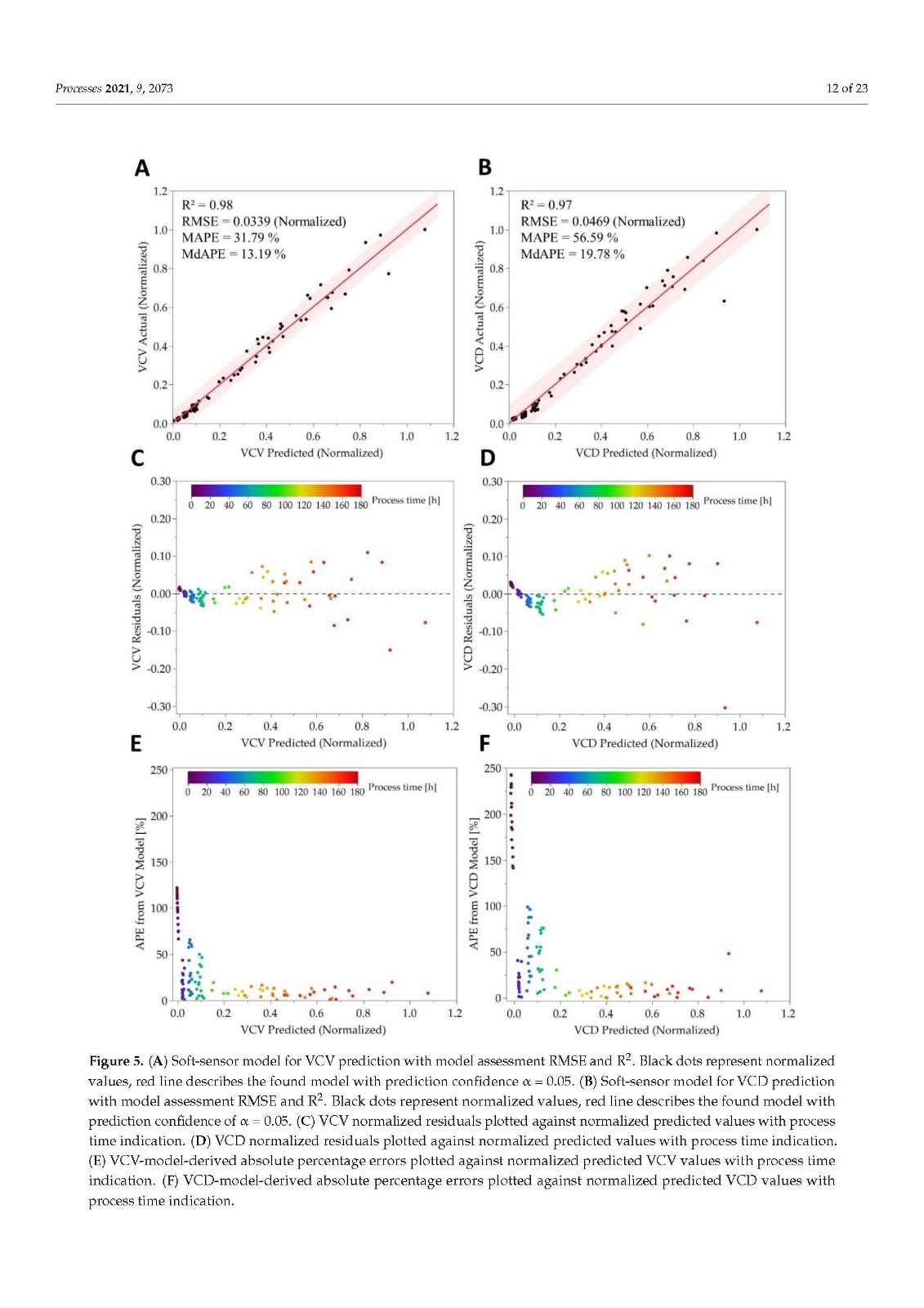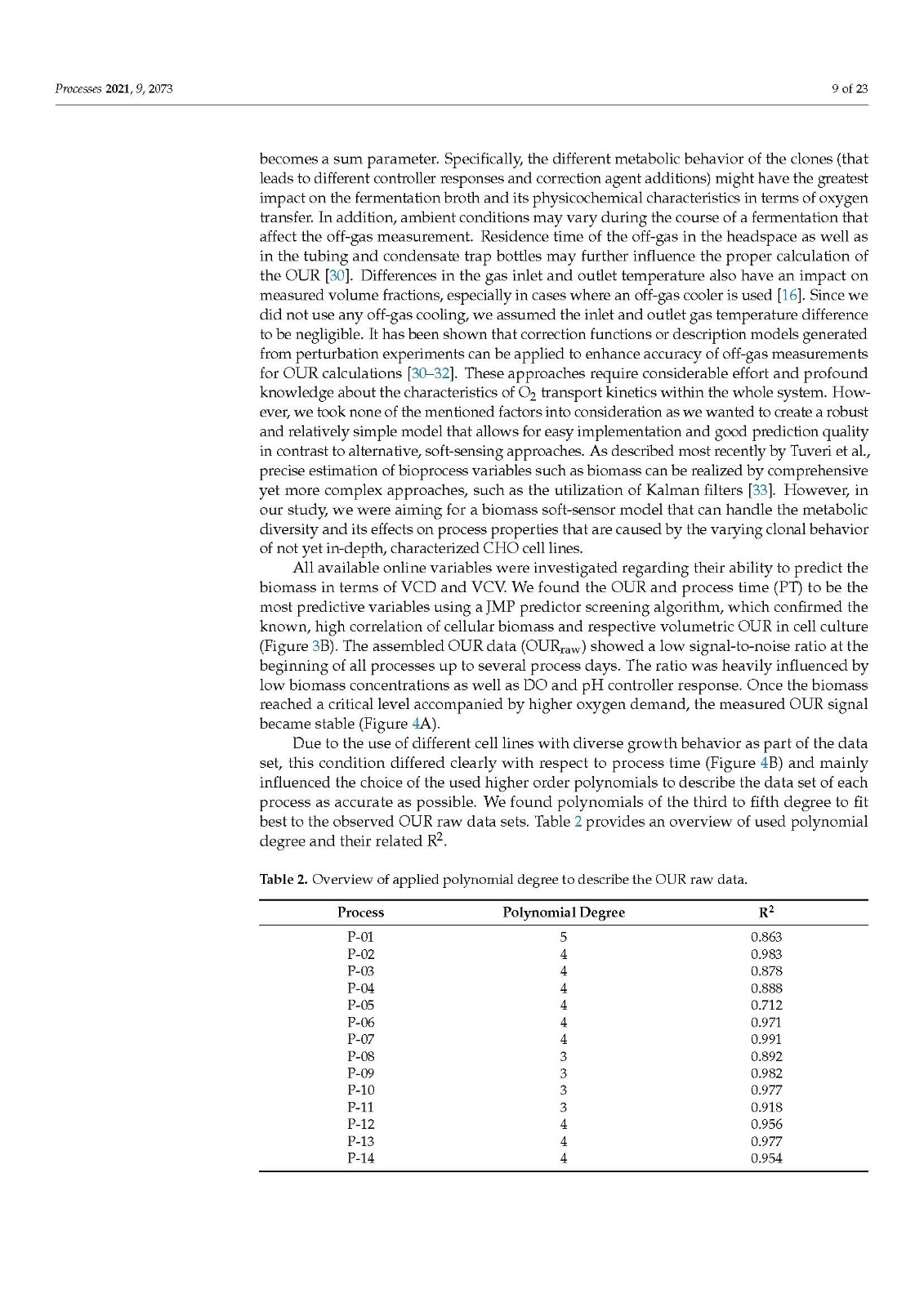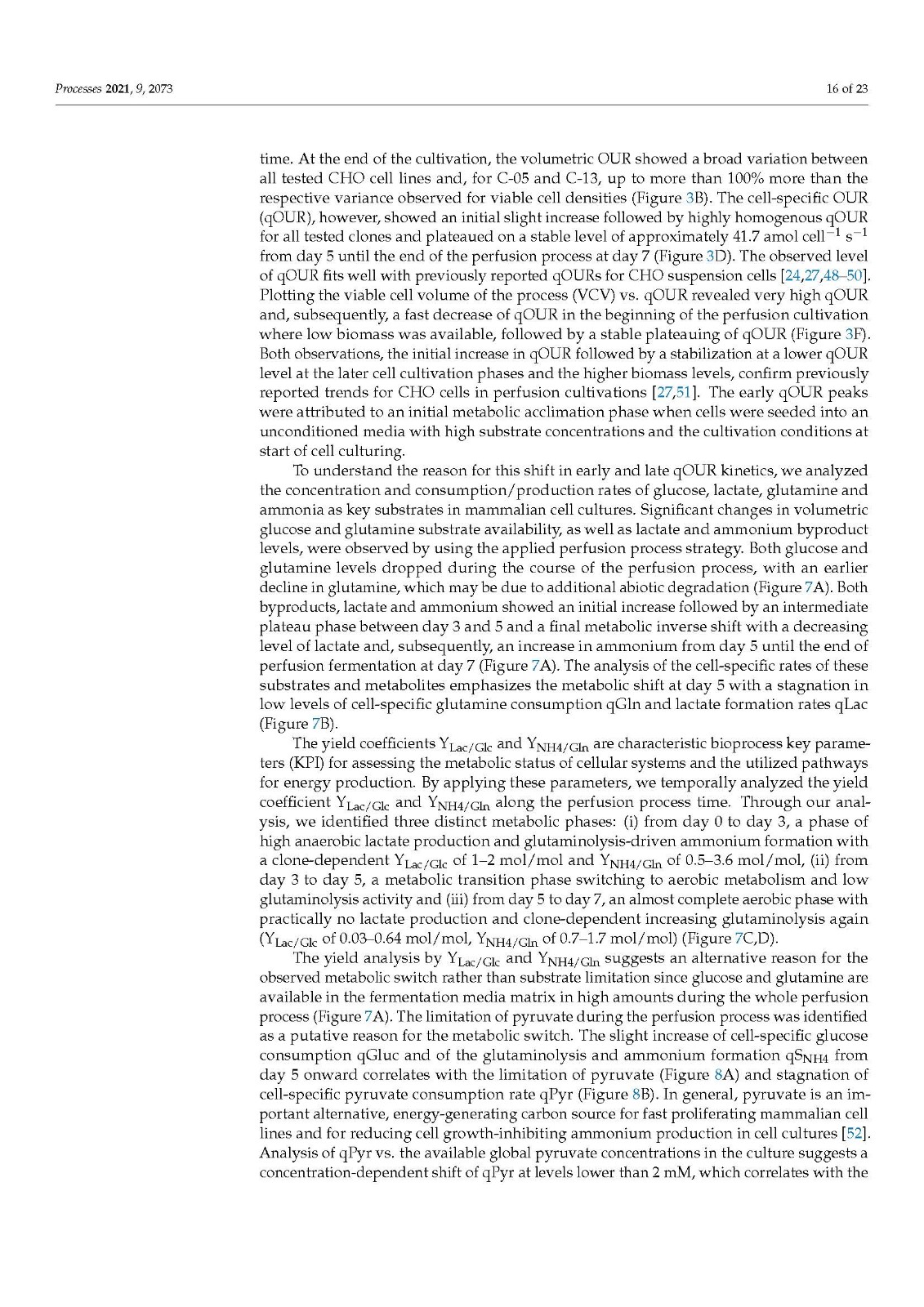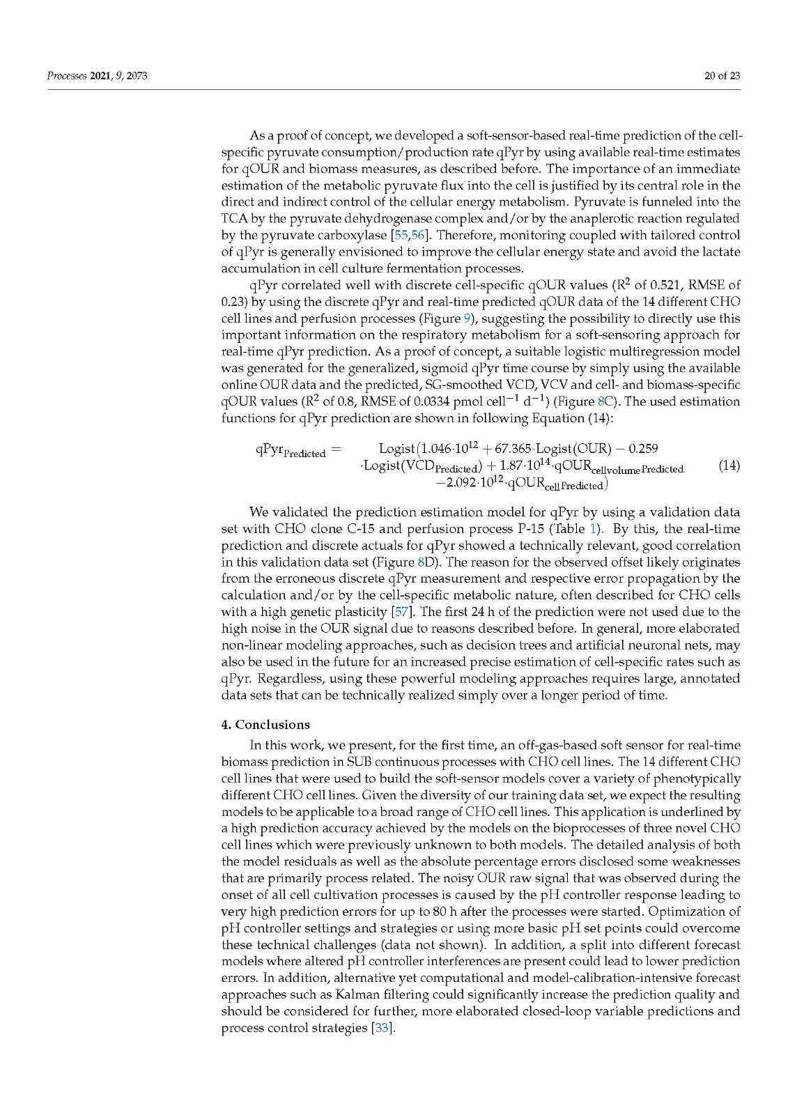 Our data also demonstrated that higher model accuracy was established when VCV instead of VCD was used as biomass depiction. This strengthens our strong belief in a paradigm change regarding biomass description in modern bioprocesses. VCD should no longer be the leading, or the only, measurement looked at when it comes to biomass determination. The cell size or volume, its distribution over time and, of course, the VCV should be used by default to accurately describe the biomass and all derived metabolic variables, such as mAB, lactate production rate, or glucose/oxygen consumption rates. Conclusions, based only on cell density measurements, can lead to wrong assumptions, calculations or other unforeseen misinterpretations, generating a fragmented picture of the biomass [38,40]. As modern bioprocesses can be highly complex and dynamic, the biomass and cellular metabolism analysis should be as comprehensive as possible to generate a comparable and reproducible data basis. Furthermore, the utilization of an off-gas-based soft sensor is easy to implement in SUB systems as well as in common stainless steel plants. For this purpose, the installation of any hard-type probes inside the bioreactor is not necessary and does not increase handling or decrease safety and therefore prevents possible contamination risks. The fundamental correlation of biomass growth and increasing oxygen demand can be used, optimized and extended to generate profound real-time knowledge on diverse bioprocess variables such as the shown biomass and metabolic nutrient rate soft sensor. Moreover, off-gas analysis can be used to determine the true bioreactor pH without any sampling or as non-invasive method for online pCO2 monitoring, which underlines the flexibility and outstanding character of having an off-gas analyzer implemented and running.
