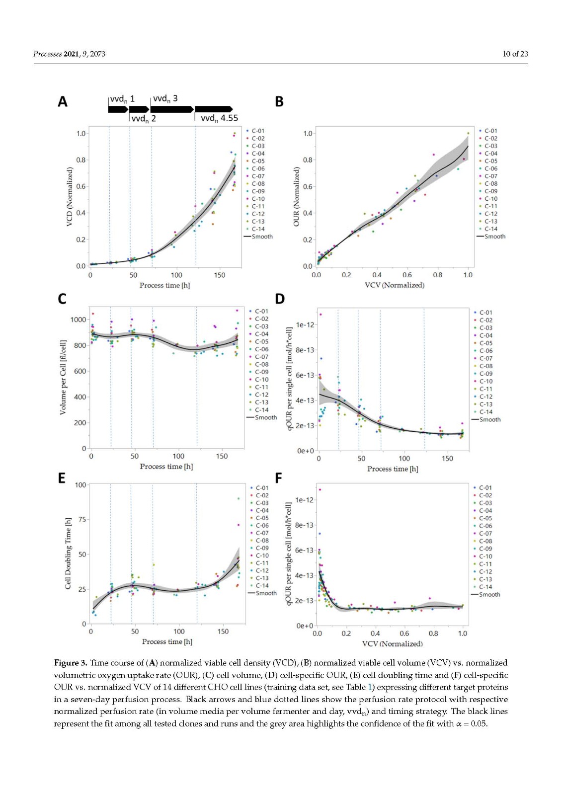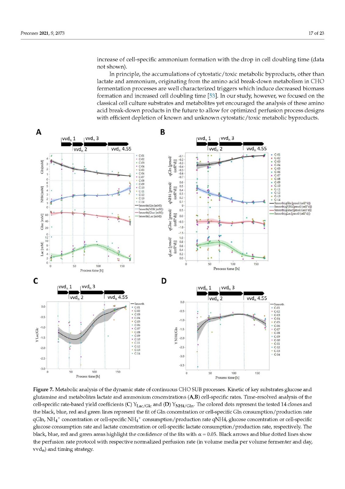 在哺乳动物细胞培养中,尤其是在药物制造和研究中,生物量和代谢监测对于开发和最终控制生物过程的各种细胞培养过程步骤是必不可少的。作为生物量的常用度量,活细胞密度 (VCD) 或活细胞体积 (VCV) 被广泛使用。本研究首次强调了使用 VCV 代替 VCD 作为生物量描述的优势,结合基于吸氧率 (OUR) 的软传感器,用于实时生物量估算和一次性过程控制中国仓鼠卵巢 (CHO) 细胞系的生物反应器 (SUB) 连续过程。我们研究了一系列 14 个技术上相似的连续 SUB 工艺,其中使用了相同的工艺条件但使用了不同的表达 CHO 细胞系,关于生物量增长和需氧量来校准我们的模型。此外,我们通过外代谢组学方法分析了 SUB 灌注过程中 CHO 细胞的关键代谢,强调了细胞特异性底物和代谢物消耗以及生产率 qS 分析对识别不同代谢阶段的重要性。CHO 灌注过程中经典哺乳动物细胞培养关键底物和代谢物的细胞特异性速率显示出与 qOUR 的良好相关性,但出人意料的是,与 qGluc 无关。在这里,我们介绍了我们为 qPyr 开发的软传感方法,以允许实时近似细胞代谢和使用情况,以便进行后续深入的过程监测、表征和优化。我们通过外代谢组学方法分析了 SUB 灌注过程中 CHO 细胞的关键代谢,强调了细胞特异性底物和代谢物消耗以及生产率 qS 分析对识别不同代谢阶段的重要性。CHO 灌注过程中经典哺乳动物细胞培养关键底物和代谢物的细胞特异性速率显示出与 qOUR 的良好相关性,但出人意料的是,与 qGluc 无关。在这里,我们介绍了我们为 qPyr 开发的软传感方法,以允许实时近似细胞代谢和使用情况,以便进行后续深入的过程监测、表征和优化。我们通过外代谢组学方法分析了 SUB 灌注过程中 CHO 细胞的关键代谢,强调了细胞特异性底物和代谢物消耗以及生产率 qS 分析对识别不同代谢阶段的重要性。CHO 灌注过程中经典哺乳动物细胞培养关键底物和代谢物的细胞特异性速率显示出与 qOUR 的良好相关性,但出人意料的是,与 qGluc 无关。在这里,我们介绍了我们为 qPyr 开发的软传感方法,以允许实时近似细胞代谢和使用情况,以便进行后续深入的过程监测、表征和优化。强调细胞特异性底物和代谢物消耗和生产率 qS 分析的重要性,以确定不同的代谢阶段。CHO 灌注过程中经典哺乳动物细胞培养关键底物和代谢物的细胞特异性速率显示出与 qOUR 的良好相关性,但出人意料的是,与 qGluc 无关。在这里,我们介绍了我们为 qPyr 开发的软传感方法,以允许实时近似细胞代谢和使用情况,以便进行后续深入的过程监测、表征和优化。强调细胞特异性底物和代谢物消耗和生产率 qS 分析的重要性,以确定不同的代谢阶段。CHO 灌注过程中经典哺乳动物细胞培养关键底物和代谢物的细胞特异性速率显示出与 qOUR 的良好相关性,但出人意料的是,与 qGluc 无关。在这里,我们介绍了我们为 qPyr 开发的软传感方法,以允许实时近似细胞代谢和使用情况,以便进行后续深入的过程监测、表征和优化。