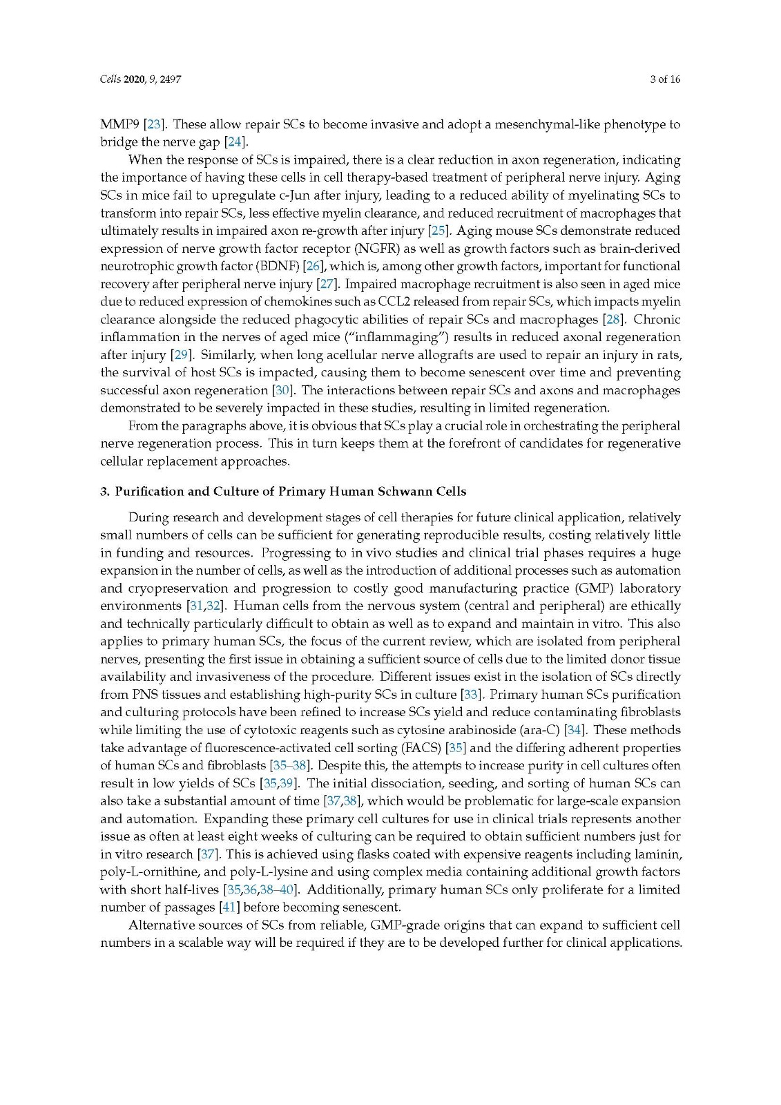 Schwann cells play a critical role in peripheral nerve repair through axon guidance and promoting the establishment of a pro-regenerative environment in the nerve bridge. However, primary SCs may not be ideal for efficient use in cell therapies, due mainly to difficulties in purifying and a long expansion process. Despite extensive efforts to develop reliable methods to differentiate stem cells to SCs as an alternative source, both adult stem cells and ESCs have drawbacks—from low purity and yield, non-neuronal differentiation potential, and accessibility of cells, to ethical considerations. Although therapies using differentiated cells sourced from iPSCs will require extensive screening prior to use, iPSCs have the benefits of ESCs without the drawback of ethical concerns which have been cited as a potential barrier to the application of ESC therapies worldwide.