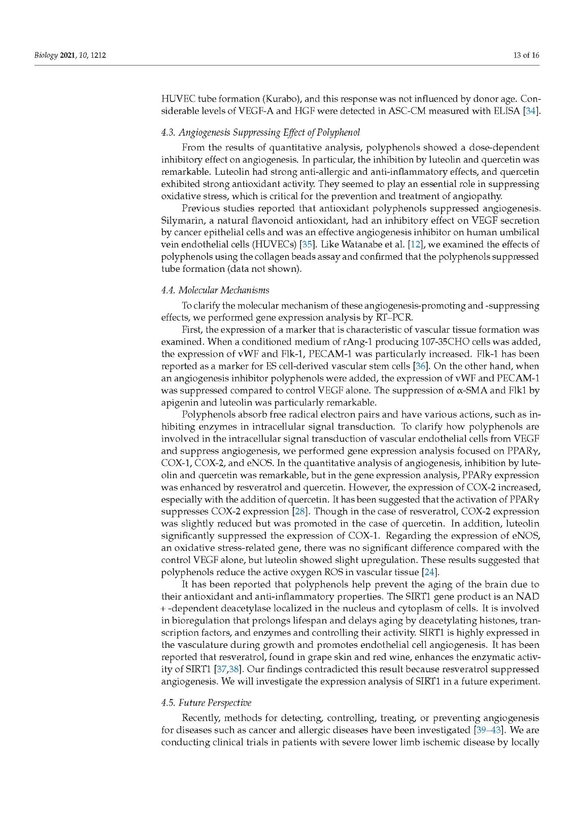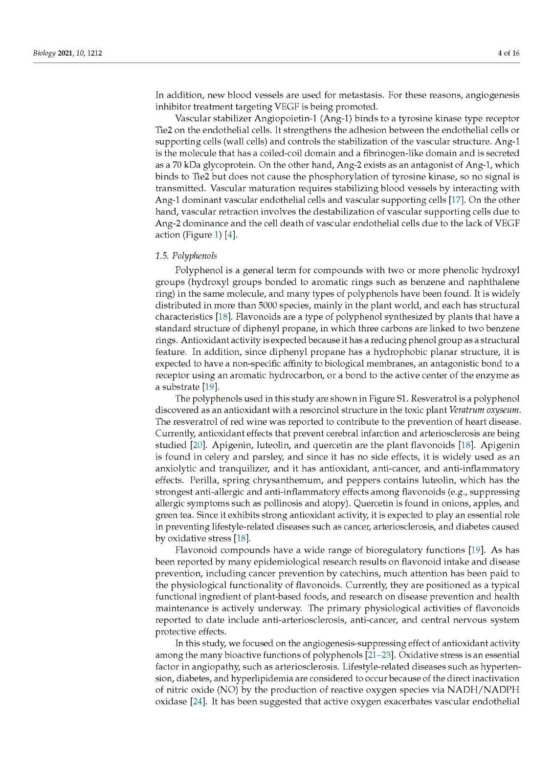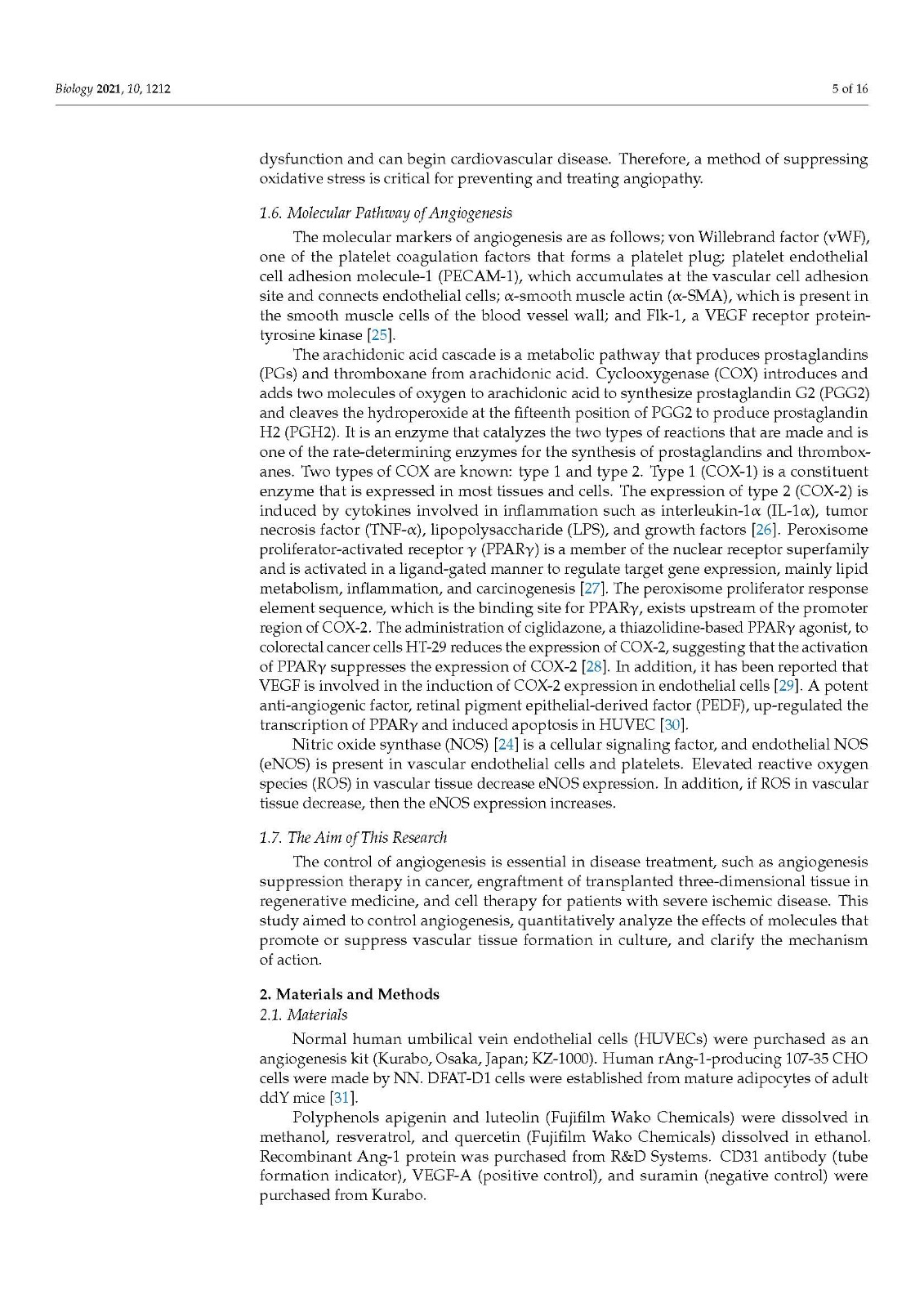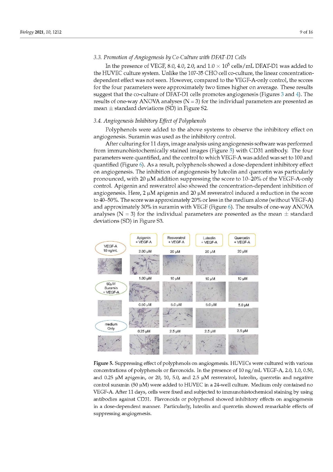 Polyphenols apigenin and luteolin (Fujifilm Wako Chemicals) were dissolved in methanol, resveratrol, and quercetin (Fujifilm Wako Chemicals) dissolved in ethanol. Recombinant Ang-1 protein was purchased from R&D Systems. CD31 antibody (tube formation indicator), VEGF-A (positive control), and suramin (negative control) were purchased from Kurabo.