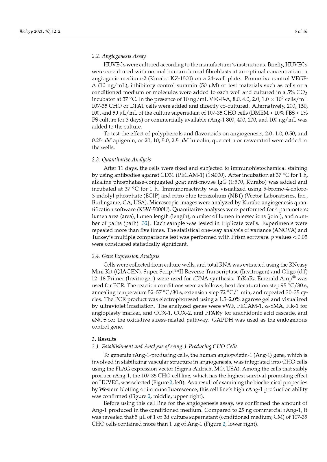 根据制造商的说明培养 HUVEC。简而言之,将 HUVEC 与正常人真皮成纤维细胞以最佳浓度共培养在 24 孔板上的血管生成培养基 2(Kurabo KZ-1500)中。将促进对照 VEGF-A (10 ng/mL)、抑制对照苏拉明 (50 μM) 或测试材料(如细胞或条件培养基或分子)添加到每个孔中,并在 5% CO 2培养箱中于 37°C 下培养。在 10 ng/mL VEGF-A 存在下,添加 8.0、4.0、2.0、1.0 × 10 5细胞/mL 107-35 CHO 或 DFAT 细胞并直接共培养?;蛘?,200、150、100 和 50 μL/mL 的 107-35 CHO 细胞培养上清液(DMEM + 10% FBS + 1% PS 培养 3 天)或市售 rAng-1 800、400、200,并向培养物中加入 100 ng/mL。为了测试多酚和类黄酮对血管生成的影响,将 2.0、1.0、0.50 和 0.25 μM 芹菜素,或 20、10、5.0、2.5 μM 木犀草素、槲皮素或白藜芦醇添加到孔中。
