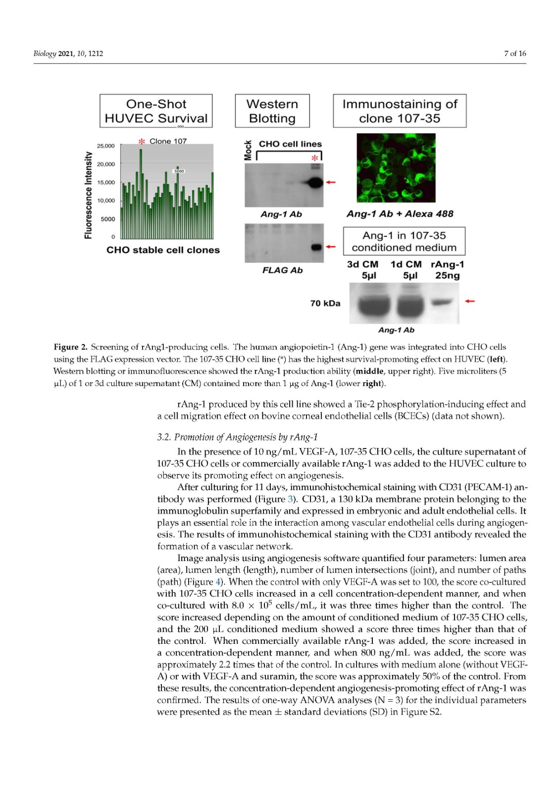 Normal human umbilical vein endothelial cells (HUVECs) were purchased as an angiogenesis kit (Kurabo, Osaka, Japan; KZ-1000). Human rAng-1-producing 107-35 CHO cells were made by NN. DFAT-D1 cells were established from mature adipocytes of adult ddY mice [31].