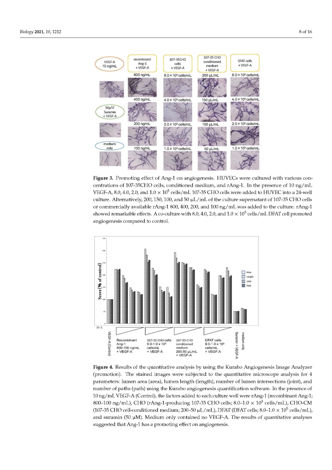 HUVECs were cultured according to the manufacturer’s instructions. Briefly, HUVECs were co-cultured with normal human dermal fibroblasts at an optimal concentration in angiogenic medium-2 (Kurabo KZ-1500) on a 24-well plate. Promotive control VEGF-A (10 ng/mL), inhibitory control suramin (50 μM) or test materials such as cells or a conditioned medium or molecules were added to each well and cultured in a 5% CO2 incubator at 37 °C. In the presence of 10 ng/mL VEGF-A, 8.0, 4.0, 2.0, 1.0 × 105 cells/mL 107-35 CHO or DFAT cells were added and directly co-cultured. Alternatively, 200, 150, 100, and 50 μL/mL of the culture supernatant of 107-35 CHO cells (DMEM + 10% FBS + 1% PS culture for 3 days) or commercially available rAng-1 800, 400, 200, and 100 ng/mL was added to the culture.